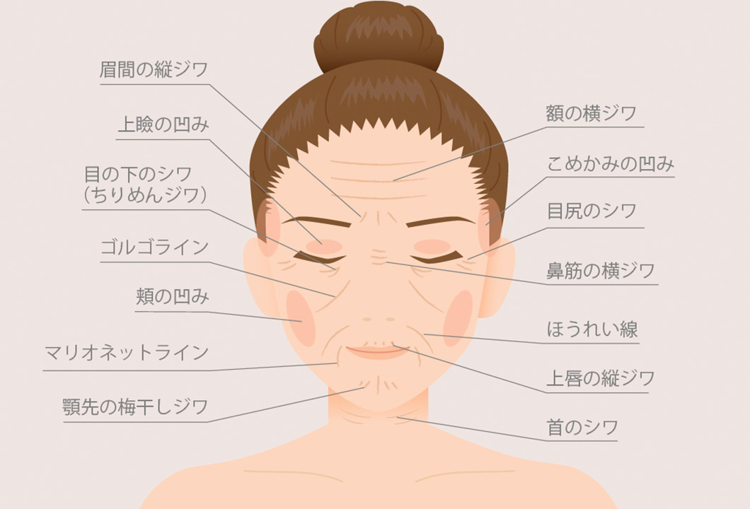●小ジワ・たるみ:乾燥ジワ、鼻筋の横ジワ、上唇の縦ジワ、目の下のちりめんジワ、目尻のシワ