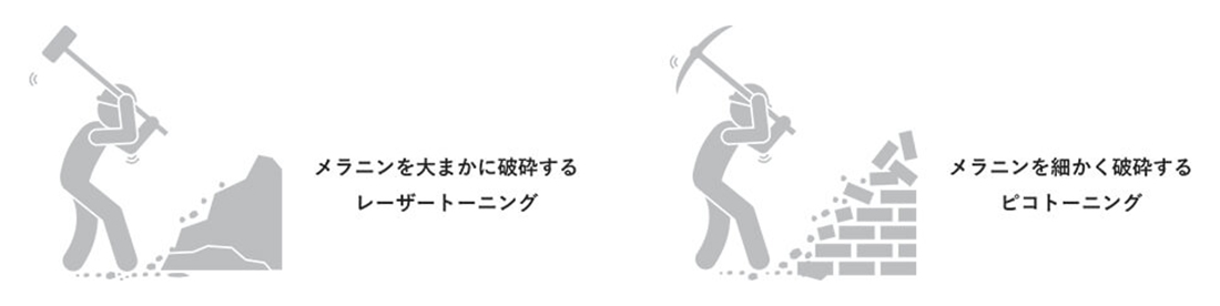上記イラスト右図のように、さらにシミやアザを細かく破砕してきれいに取ることができるピコレーザーを低出力で高速照射します。レーザートーニングでは改善できなかったシミ、くすみの治療やキレイになったお肌のメンテナンスが痛みや赤みを気にすることなく可能となりました。このピコトーニングに、特殊なレンズを装着するフラクショナルの照射モードで「シワ、たるみ」を改善させるピコフラクショナルレーザーを併用する複合治療です。