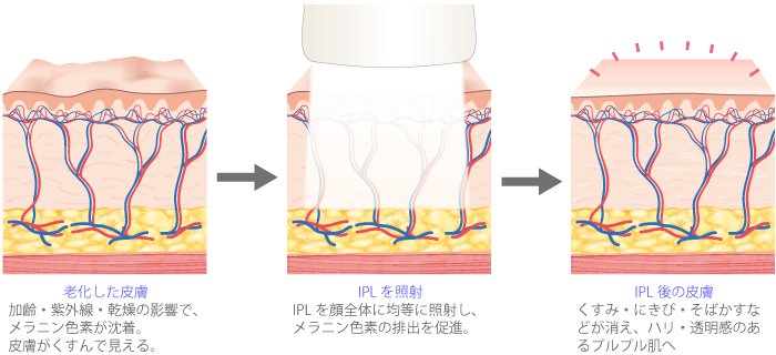 表皮と真皮に働きかけ、一般的なシミ(老人性色素斑)やソバカスはもちろん肝斑、小ジワ、毛穴の開きなどさまざまな症状を同時に改善することができます。また、照射により皮膚のターンオーバーがよくなり、肌のトーンが明るくなります。