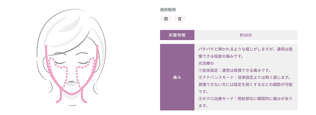 表皮と真皮に働きかけ、一般的なシミ(老人性色素斑)やソバカスはもちろん肝斑、小ジワ、毛穴の開きなどさまざまな症状を同時に、 ほぼダウンタイムなく改善することができます。 また、照射により皮膚のターンオーバーがよくなり、肌のトーンが明るくなります。2種類のレーザーと光治療を組み合わせて シミ・くすみのない透き通るような肌に導きます