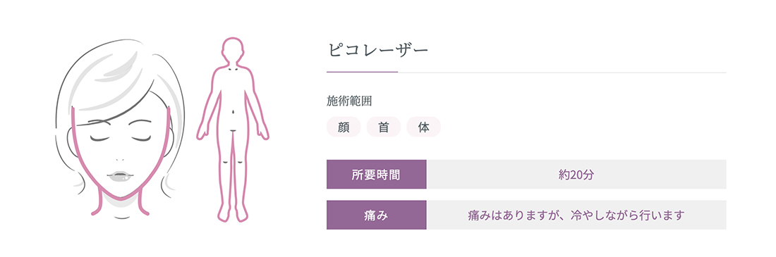 当院では、「ピコレーザー」、「ピコトーニング」、「ピコフラクショナルレーザー」の各モードと、これらのモードを組み合わせてお一人おひとりに最適な治療を行う様々なメニューをご用意しております。