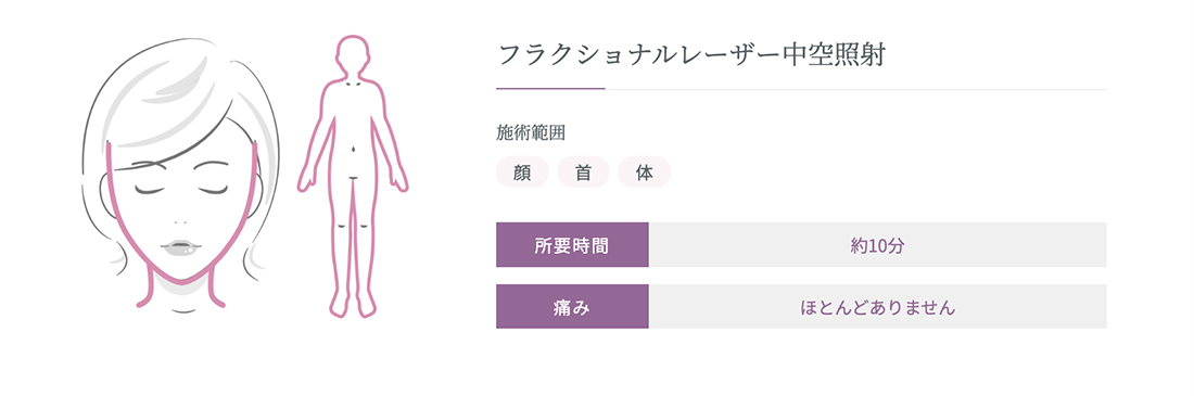 | 肌のハリ・毛穴の引き締め | レーザー熱作用でのコラーゲンの増生により肌のキメ、ハリ、毛穴を引き締めます。 |